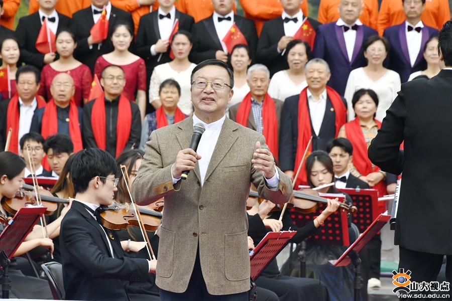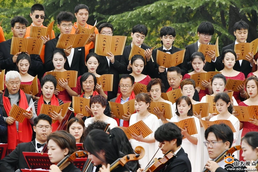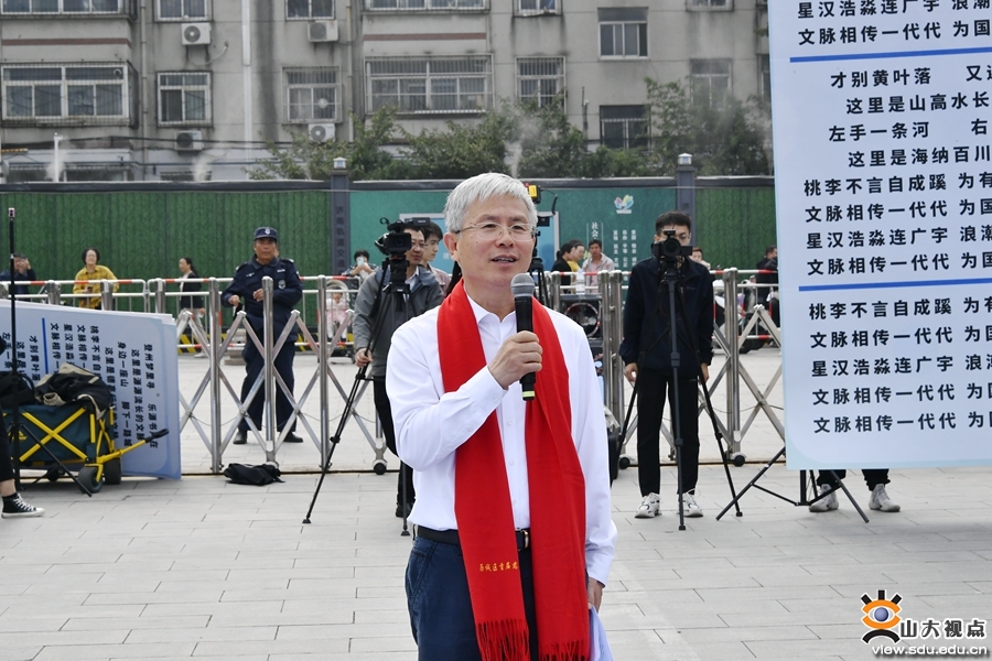 10月13日上午,各界嘉宾、校友走进山东大学中心校区,相聚大成广场,参加歌曲联唱、经典诵读活动。山东大学校长李术才出席活动。