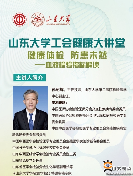 [本站讯]为深入开展学校“五大聚心工程”,推动落实“健康工程”,切实提高教职医务员工健康服务水平,帮助教职医务员工提高健康教育能力,普及健康知识、传播健康技能、培养健康理念、促进健康意识和健康行为养成,校工会、妇委会持续推出“工会健康大讲堂”系列讲座。10月27日下午,本期健康大讲堂邀请山东大学第二医院检验医学中心副主任孙昭辉教授就“健康体检 防患未然——血液检验指标解读”为题为全校教职医务员工开展线上讲解和咨询。校工会副主席程翠玉主持讲座,学校教职医务员工线上参加讲座。