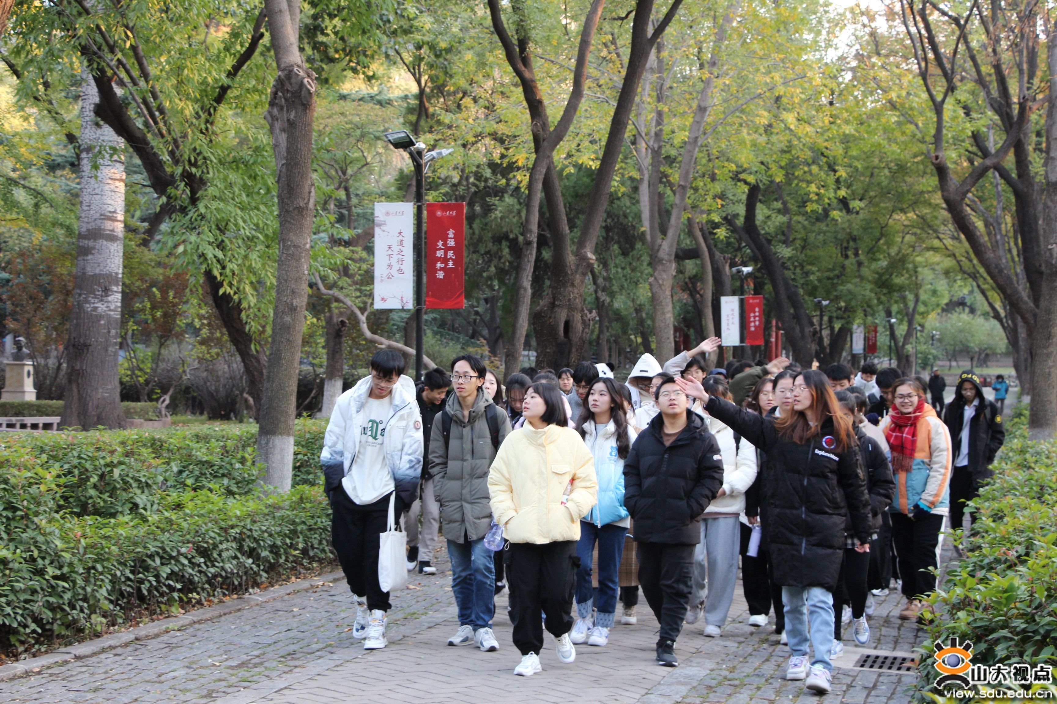 在历史悠久的趵突泉校区校园里,同学们在讲解员的带领下走进老舍笔下的“非正式公园”,参观了校园里的主要建筑和景点,聆听这些古老建筑的百年故事。