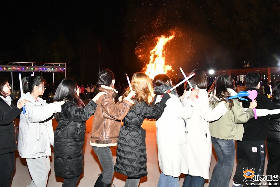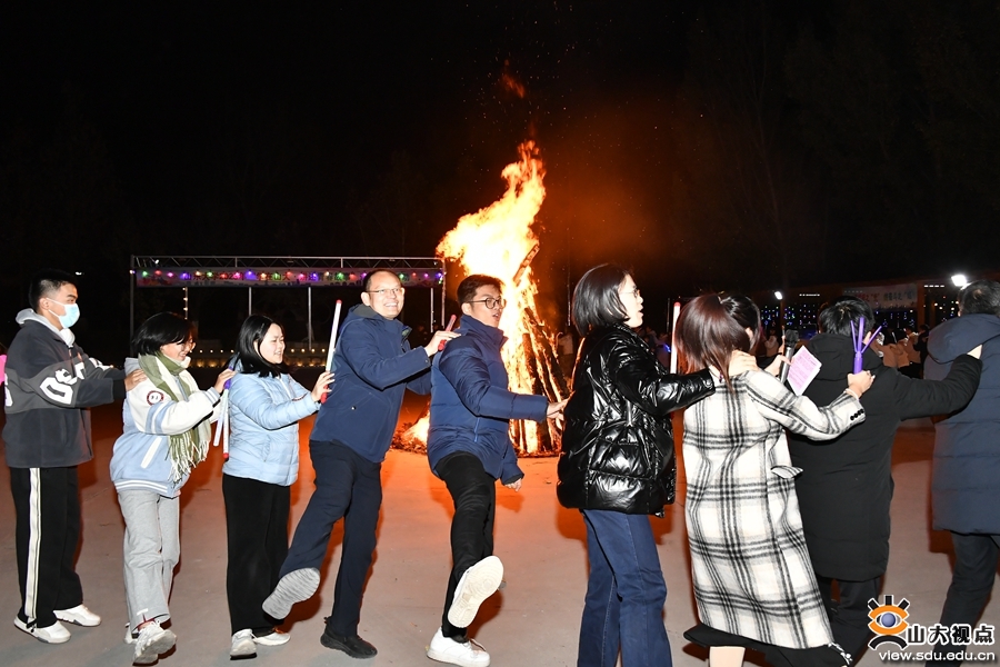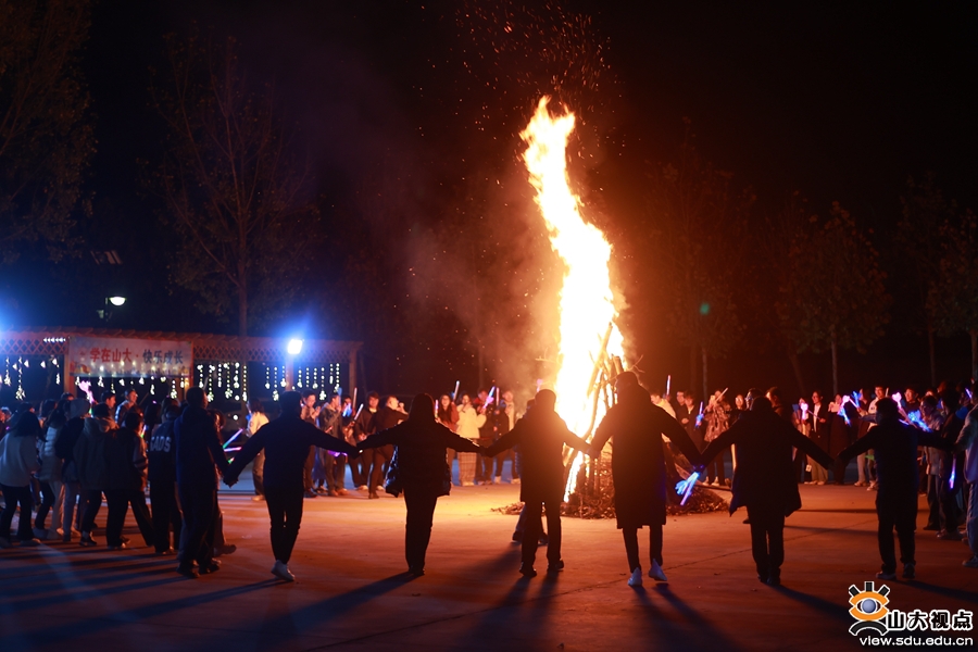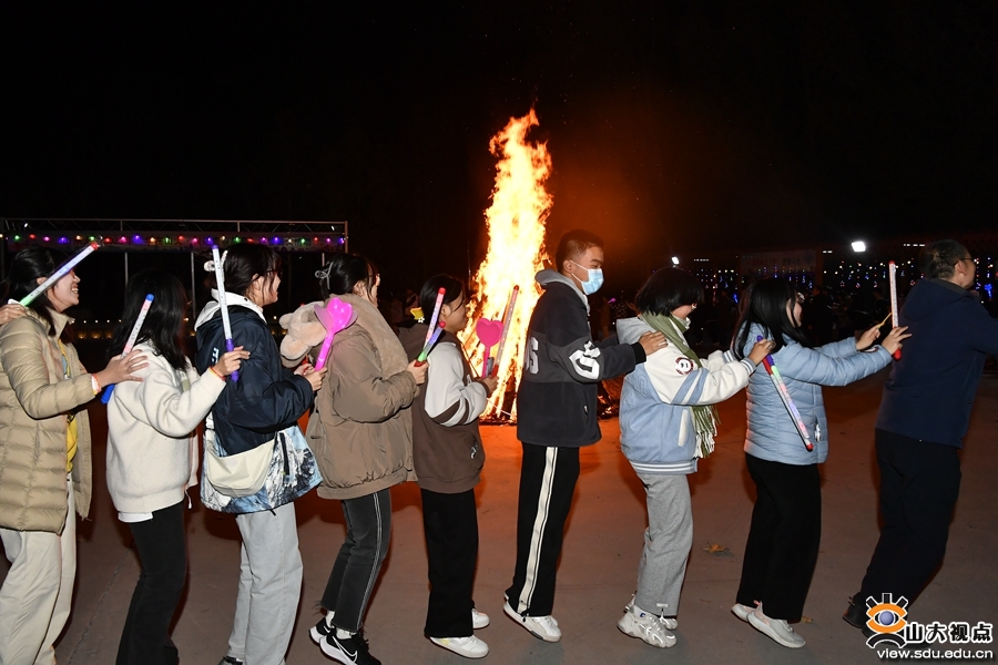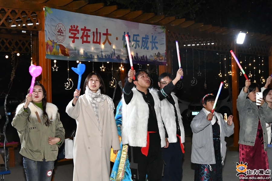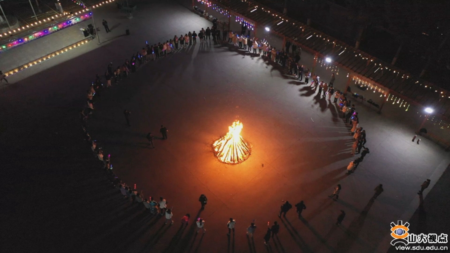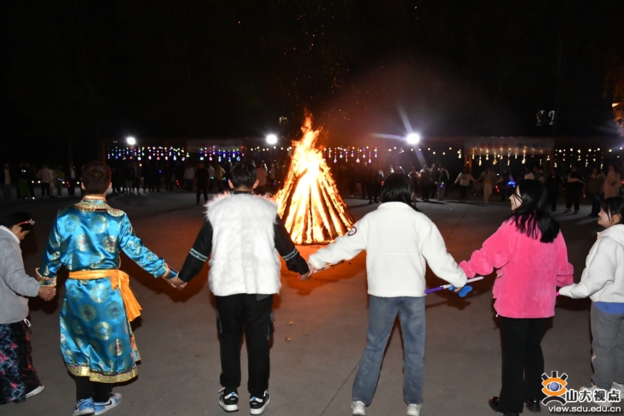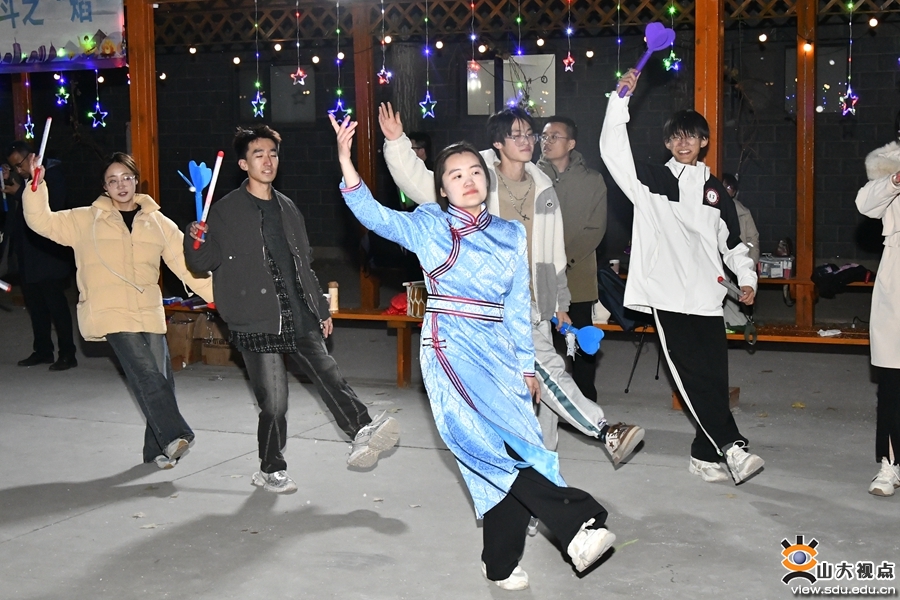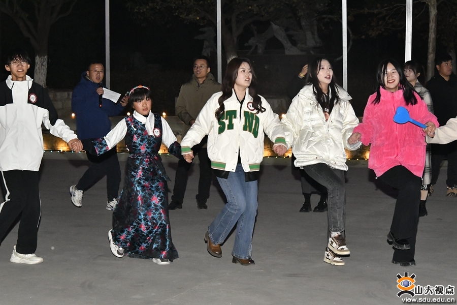 “薪传”篇章中,歌曲《稻香》唤醒了大家对童年的美好回忆,引发了全场大合唱。山东大学学生自行车协会滇藏线远征队代表杨金梦讲述了在骑行中的所见所闻,鼓励同学们脚踏实地、知行合一,真正做到“把论文写在祖国大地上”。山东大学学生石榴籽爱心社学生代表身着民族服饰,围绕篝火跳起了芒康锅庄舞,向师生传递了对美好生活的追求与向往,进一步展现了民族文化的独特魅力。