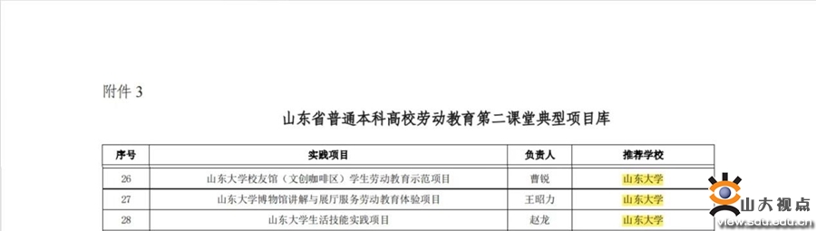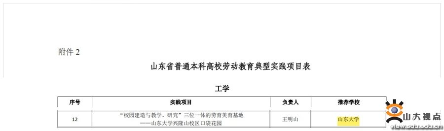 [本站讯]为贯彻落实中共中央、国务院《关于全面加强新时代大中小学劳动教育的意见》(中发〔2020〕7 号)精神,落实山东省《加快推进新时代普通高等学校劳动教育行动指南》有关部署,山东省普通高校劳动教育教学指导委员会组织开展山东省普通本科高校劳动教育典型教学案例和实践项目征集工作。山大认真筹备,积极申报,共有4项目入选,入选数量位居全省高校前列。“校园建造与教学、研究”三位一体的劳育美育基地——山东大学兴隆山校区口袋花园项目入选山东省普通本科高校劳动教育典型实践项目,山东大学校友馆(文创咖啡区)学生劳动教育示范项目、山东大学博物馆讲解与展厅服务劳动教育体验项目及山东大学生活技能实践项目入选山东省普通本科高校劳动教育第二课堂典型项目。