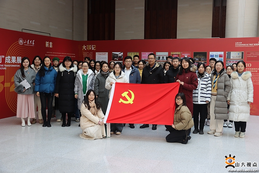 两个党支部全体党员在讲解员的解说下,全面了解了展览内容。中华优秀传统文化“两创”成果展是山东大学系统梳理和全面展示近十年来在文化传承领域取得的重要成就,推动中华优秀传统文化创造性转化和创新性发展而举办的展览。整个展览根据主题脉络分为五大单元,分别是大事记、重大项目、专著、论文和学术活动。为了响应十周年中“十”这个数字,每个单元都挑选了最有影响力的十个代表。整个展板设计采取山大红渐变色呈现,辅以金色的图形贯穿始终,其中 “2013-2023”和数字“10”代表“两创”方针自提出十周年,学校剪影和校徽中的山水相见图案穿插其中,简单大气。