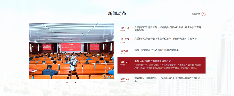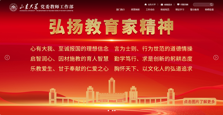 [本站讯] 为进一步发挥新媒体传播优势,大力宣传党的路线方针政策,贯彻落实教育家精神,统一思想,凝心聚力,讲好山大师德故事,展现新时代教师队伍风采,反映学校教师工作特色成效,12月12日,党委教师工作部官方网站完成改版,正式上线。