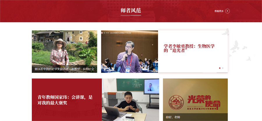 教工部将以此次网站改版更新为契机,不断探索搭建教职工学习、教育、交流、展示的平台,营造尊师重教的良好氛围,让全体教职工充分感受身边人身边事带来的感动、荣耀和力量,深化对教育神圣职责使命的理解认识和担当坚守,更好地实现思想引领目标,不断开创教师思想政治和师德师风建设工作新局面。