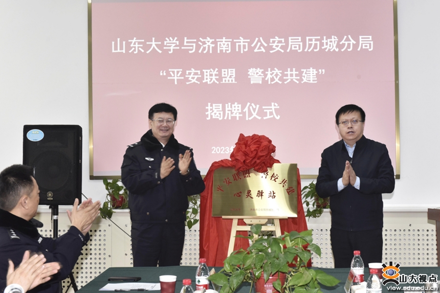 济南市公安局历城区分局、山大路派出所有关负责人及全体心理教官,山东大学党委教师工作部、党委保卫部、研究生院有关负责人,心理中心全体教师参加揭牌仪式。
