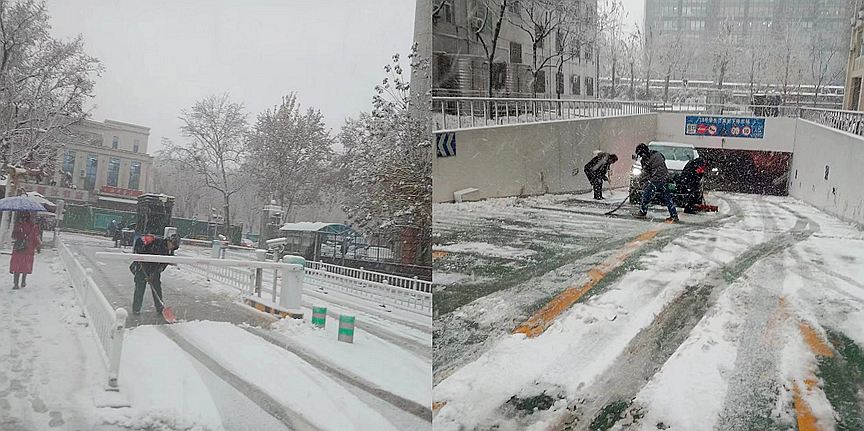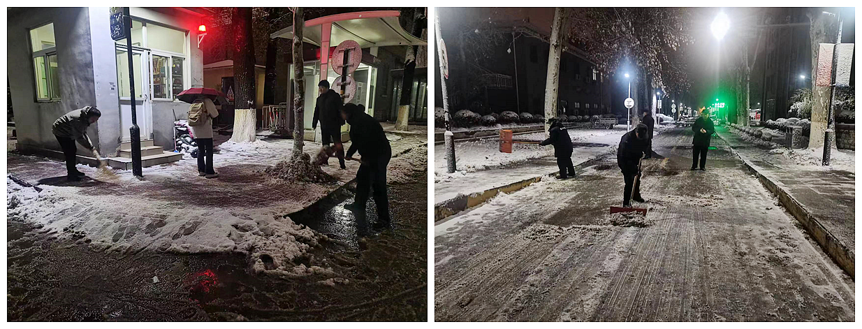 14日,先雨后雪,校园道路积雪较厚,党委保卫部立即组织除雪,保障校内道路畅通和师生安全出行。