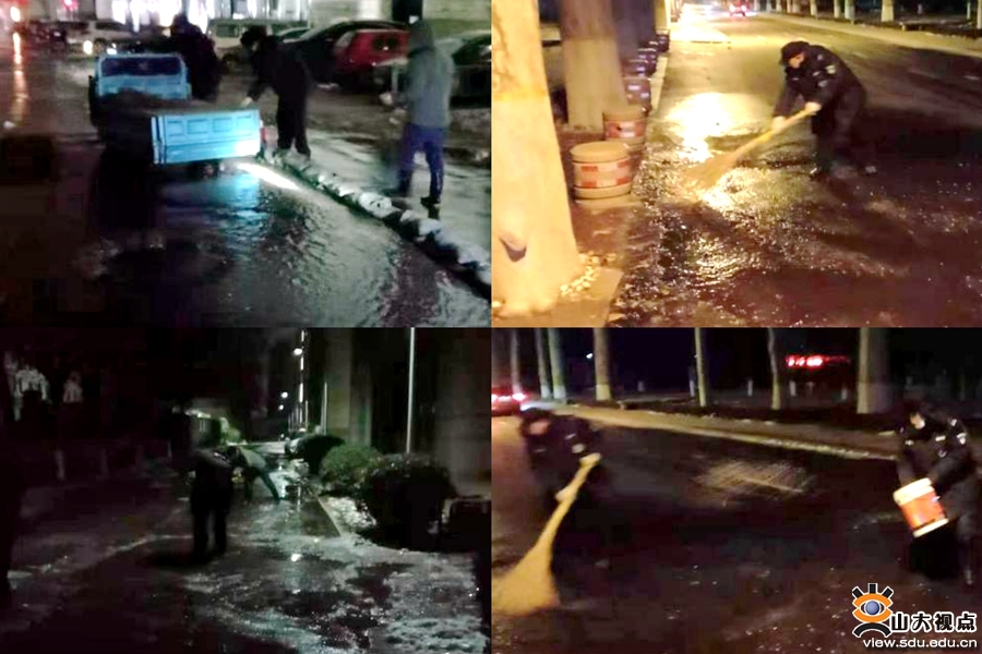 考试首日凌晨3点50分左右,位于中心校区西南门外的一处市政管道因极寒天气,导致管道爆裂,大量自来水喷涌而出。学校地势较低,喷出的水不断地向校园流淌,再加上低温,很快上冻结冰。校门值班安保队员第一时间发现情况后,立即报告值班干部,成立应急小队,迅速赶赴现场进行维修。同时应急小队运来30余包沙袋,堆成防水坝,防止水流进一步流向校园。随后,应急小队人员在值班干部的带领下,向结冰路面喷洒融雪剂,及时清理现场,铲除冰层,历时3个多小时的奋力苦干,终于将道路清扫完毕,恢复正常通行,确保当日上午考生安全、顺利入校。