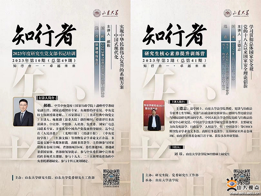 [本站讯]“知行者”研究生核心素养提升训练营是山东大学于2021年启动的思政育人品牌活动,由研究生院、党委研究生工作部主办,一校三地各研究生培养单位申办,研究生团工委作为学生组织协办。品牌紧抓“研究生发展核心素养”关键词,围绕文化基础、自主发展、社会参与三个框架,在人文底蕴、科学精神、学会学习、健康生活、责任担当、实践创新等方面,从十八个维度开展相关课程培训。2023年度山东大学“知行者”研究生核心素养提升训练营共开展活动13期,覆盖5000余人次研究生参与;共举办讲座15场,共有700余位同学在小程序进行课程打卡。