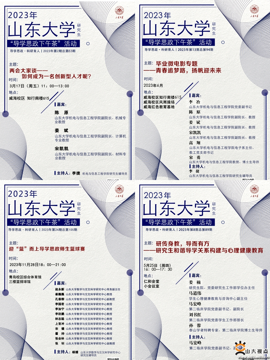 [本站讯]山东大学研究生“导学思政下午茶”活动是学校为实施研究生思想政治工作提升计划,把思想政治工作贯穿教育教学全过程开展的思政育人品牌,由研究生院、党委研究生工作部主办,一校三地各研究生培养单位承办,研究生团工委作为学生组织协办,活动由培养单位自拟形式和内容,由研究生导师、辅导员、研究生共同参加。2023年共计举办29期“导学思政下午茶”活动,受邀研究生导师150人,参与研究生千余人次。