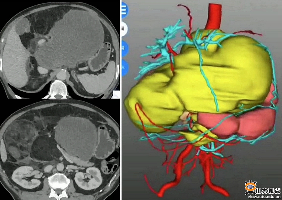 患者是一位中年男性,因腹胀喘憋就诊,检查后发现腹腔巨大肿瘤,因肿瘤侵犯多脏器、重要血管,辗转多家省市级医院后均被拒绝手术。患者抱有一线希望来到齐鲁医院就诊,李峰接诊后详细了解病情,结合外院穿刺病理脂肪肉瘤,考虑肿瘤有分段切除可能。术前,李峰团队与麻醉科、重症医学科等科室进行了充分沟通。术中,见巨大肿瘤几乎占据上腹部,完全包绕左右肝动脉、肝固有动脉、门静脉、左右肝管、胆总管、胰头、胃窦、右肾周脂肪囊、结肠系膜等,采取逐一击破策略,成功实施“腹膜后肿瘤切除+左、右肝动脉分别部分切除、端端吻合+胰十二指肠切除(其中左、右肝管分别胆肠吻合)+右半结肠切除+右肾周脂肪囊切除+右肾上腺切除术”。