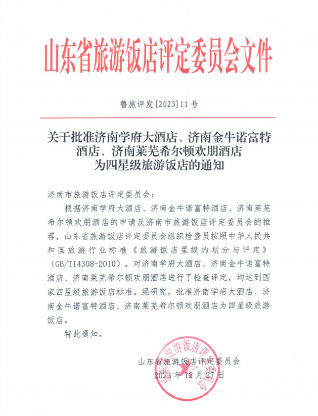 根据山东学府酒店管理有限公司学府大酒店的申请及济南市旅游饭店评定委员会的推荐,山东省旅游饭店评定委员会组织检查员按照中华人民共和国旅游行业标准《旅游饭店星级的划分与评定》(GB/T14308-2010),对学府大酒店进行了检查评定,达到国家四星级旅游饭店标准,批准学府大酒店为四星级旅游饭店。