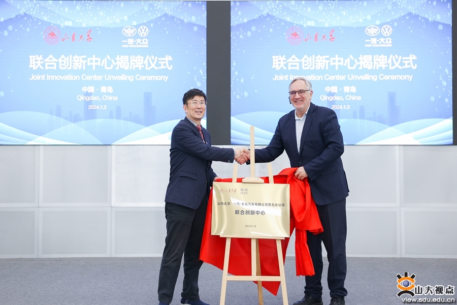 仪式上,国际创新转化学院副院长乔岳、一汽-大众青岛分公司经理刘本发代表双方签署合作协议,韩圣浩、Bruno Torres共同为“联合创新中心”揭牌。根据协议,双方将围绕科研创新、人才培养、智库建设、数字化转型等方面开展全方位、深层次、常态化合作,力争打造汽车产业科技创新领域科学研究的新高地。