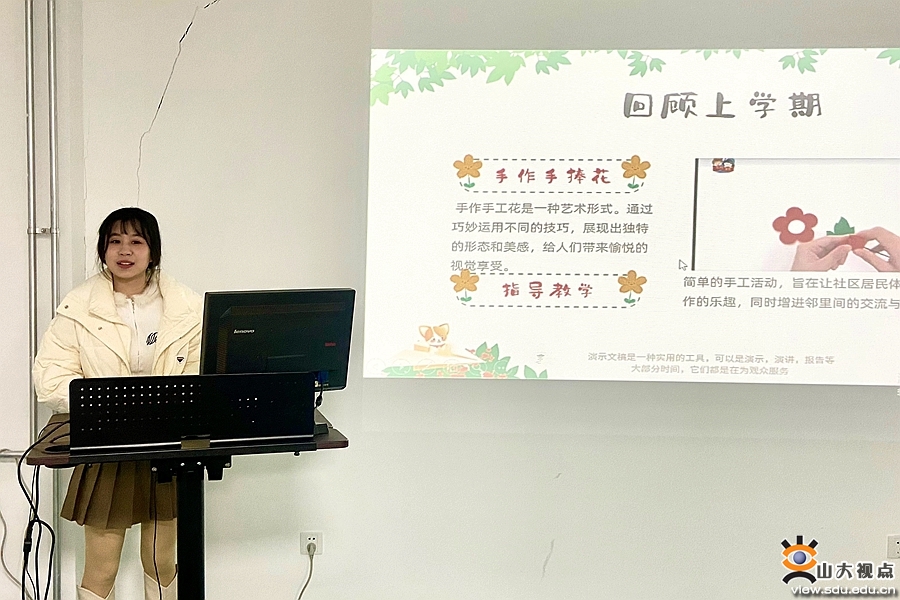 活动开始,学生志愿者通过宣讲和视频展示的形式给老人们讲解了窗花、福字以及手捧花的制作步骤。