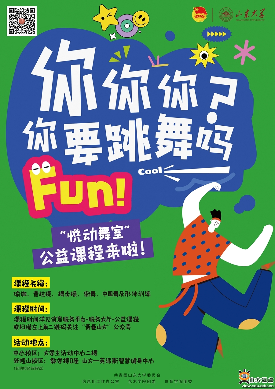 该课程为校团委联合学校信息化工作办公室、艺术学院团委、体育学院团委面向全校师生推出的美育体育公益课程“悦动舞室”,旨在进一步贯彻落实教育部《关于全面实施学校美育浸润行动的通知》,充分发挥共青团在学生思政工作中的主力军作用,共建“三全育人”“五育并举”育人格局,让学生身心更加愉悦,活力更加彰显,人格更加健全,营造“学在山大,快乐成长”的浓厚氛围。
