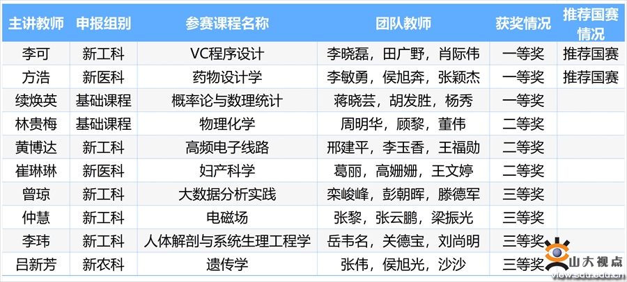 [本站讯]近日,山东省教育厅公布了2024年度山东省普通高等学校教师教学创新大赛获奖名单,山东大学参赛教师代表团获评省级一等奖3项、二等奖3项、三等奖4项,其中药学院方浩团队、控制科学与工程学院李可团队被推选至国赛,山东大学获评优秀组织奖。