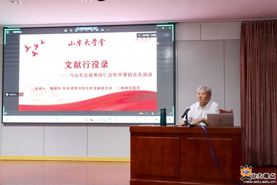 [本站讯]6月18日,“山东大学堂”第十五期暨“楮墨芸香 古韵犹存”系列讲座在中心校区图书馆举行,天津图书馆原历史文献部主任、二级研究馆员李国庆主讲“文献行役录——追忆与山东古籍界同仁合作共事的点点滴滴”。图书馆副馆长程川生主持讲座。