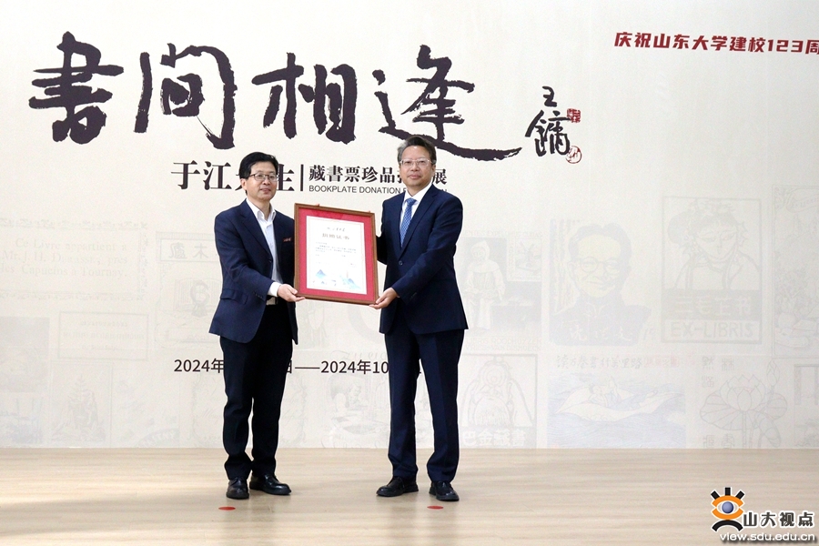 仪式上,陈宏伟向于江颁发捐赠证书。本次展览由山东大学图书馆、校友办与滨化集团联合主办,展出时间为10月20日至10月31日。展览分为“百年风华”“方寸文心”“书香蝶韵”三个篇章,展出的藏书票汇聚了我国和德国、美国等国家的精品之作,代表着不同历史阶段、不同文化背景下艺术家们的智慧与匠心,承载着作者的思想与情感。