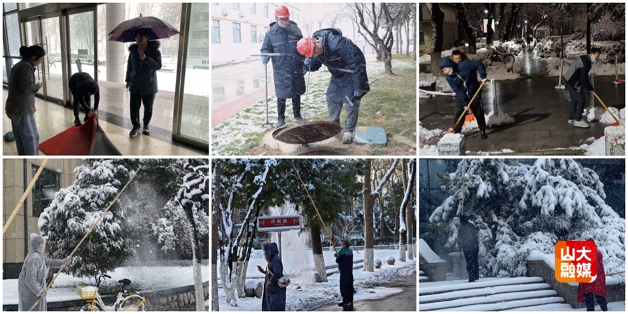 物业公司在楼宇门前放置防滑垫以及安全警示墩、提示牌,在入楼台阶泼洒融雪剂,对女贞、侧柏、雪松、广玉兰、竹子等常绿植物的积雪用竹竿、棍棒等进行清理,防止枝条被压折,及时做好树木断枝、倒伏抢险准备,确保各项防范措施到位,确保师生校园出行安全。各校区食堂安排人员清理周边积雪,保障师生就餐安全。供热公司人员全员在岗,保障校园供热平稳。