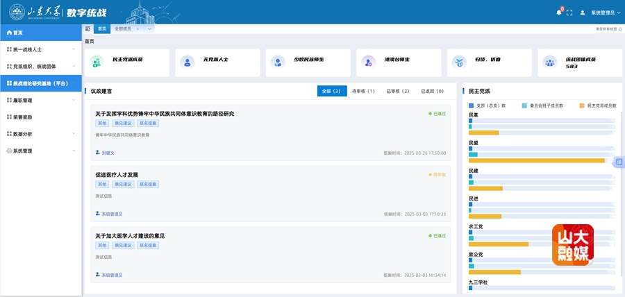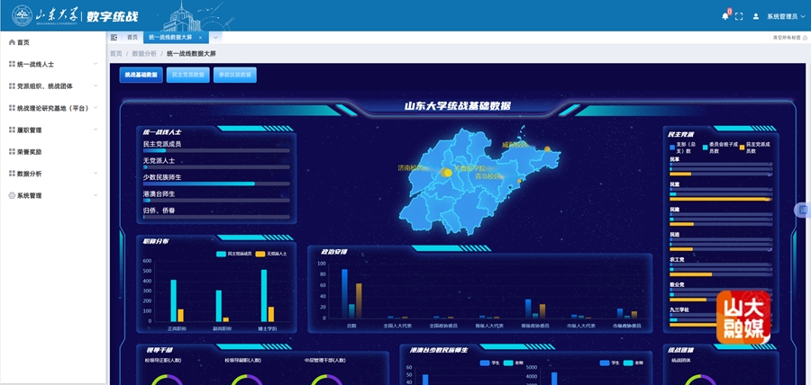“山东大学数字统战”信息系统聚焦统战工作高质量发展目标导向,探索构建“数据+服务”工作模式,在国内高校率先打造统战数据全覆盖、人才成长全链条、交流互动常态化的数字平台。系统将习近平总书记关于做好新时代党的统一战线工作的重要思想融入设计理念,直击堵点盲区、打破信息壁垒,形成“学校—校区—学院(民主党派、统战团体)—个人”四级信息共享机制,实现“面对面”与“键对键”的齐头并进,构建起网上网下大统战工作格局。