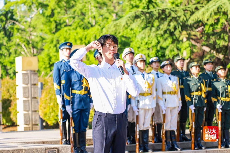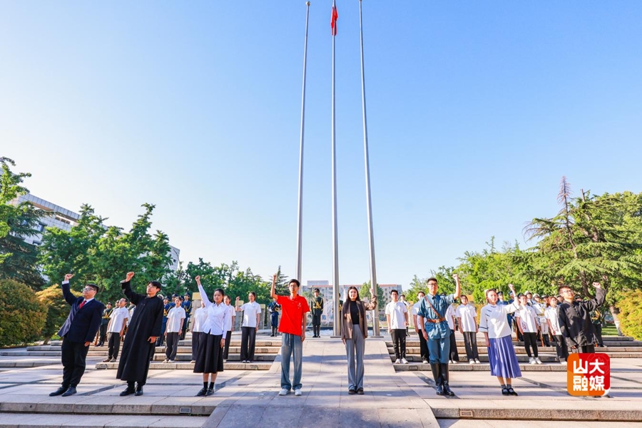 在升国旗仪式上,山东大学学生演讲协会带来情景朗诵《山大青年,从未止步》。朗诵者通过闻一多、冯沅君等历史人物,以西部计划志愿者、青年教育工作者等现代人物视角,生动再现山大基因的百年传承,彰显了新时代山大青年以奋斗作答“时代问卷”的庄严承诺。