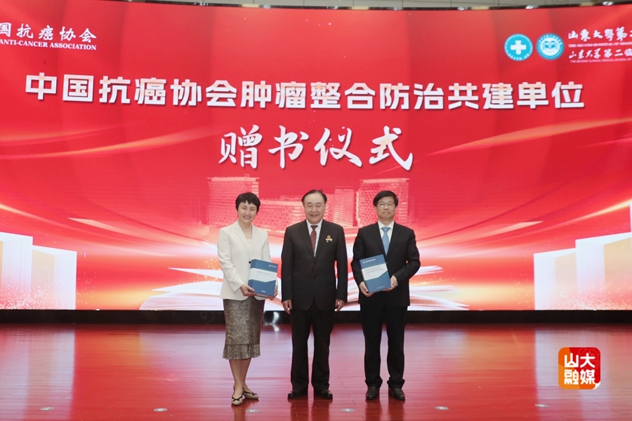 会上,樊代明、柳丽华、冯世庆共同为中国抗癌协会肿瘤整合防治共建单位落地进行揭牌。樊代明向山东大学第二医院授予“中国抗癌协会团体会员单位”,并赠送《中国肿瘤整合诊治技术指南》全套书籍。中国抗癌协会是我国肿瘤防治领域的权威学术组织,始终致力于推动肿瘤医学的科研创新、技术普及和多学科协作。此次授牌合作,标志着山东大学第二医院正式成为山东省唯一一家中国抗癌协会团体会员单位,享有优先参与协会学术活动、获得专家资源和技术支持、参与多中心临床研究项目等权益,强化临床肿瘤早筛、诊疗、科普、康复、教学、研究等关键领域能力建设,全方位守护民众健康,推动华东地区肿瘤防治事业高质量发展。
