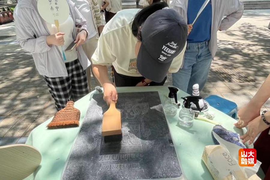 以拓为媒,对话千年匠心。馆藏青铜方壶以其精妙纹饰承载着中华文明的璀璨密码。在“青铜方壶”专题拓印体验区,师生们手持拓锤,屏息凝神,亲身复刻山东大学博物馆镇馆之宝的传奇纹饰。在同学们的敲拓之中,蟠螭纹的繁复、兽面纹的威严,随墨色深浅渐次浮现。参与者使用传统工具,在专业指导下完成清碑、上纸、捶拓、揭裱的全流程操作,在拓片与纸张的碰撞中感受文物的温度与深度,进行跨越千年的历史对话。