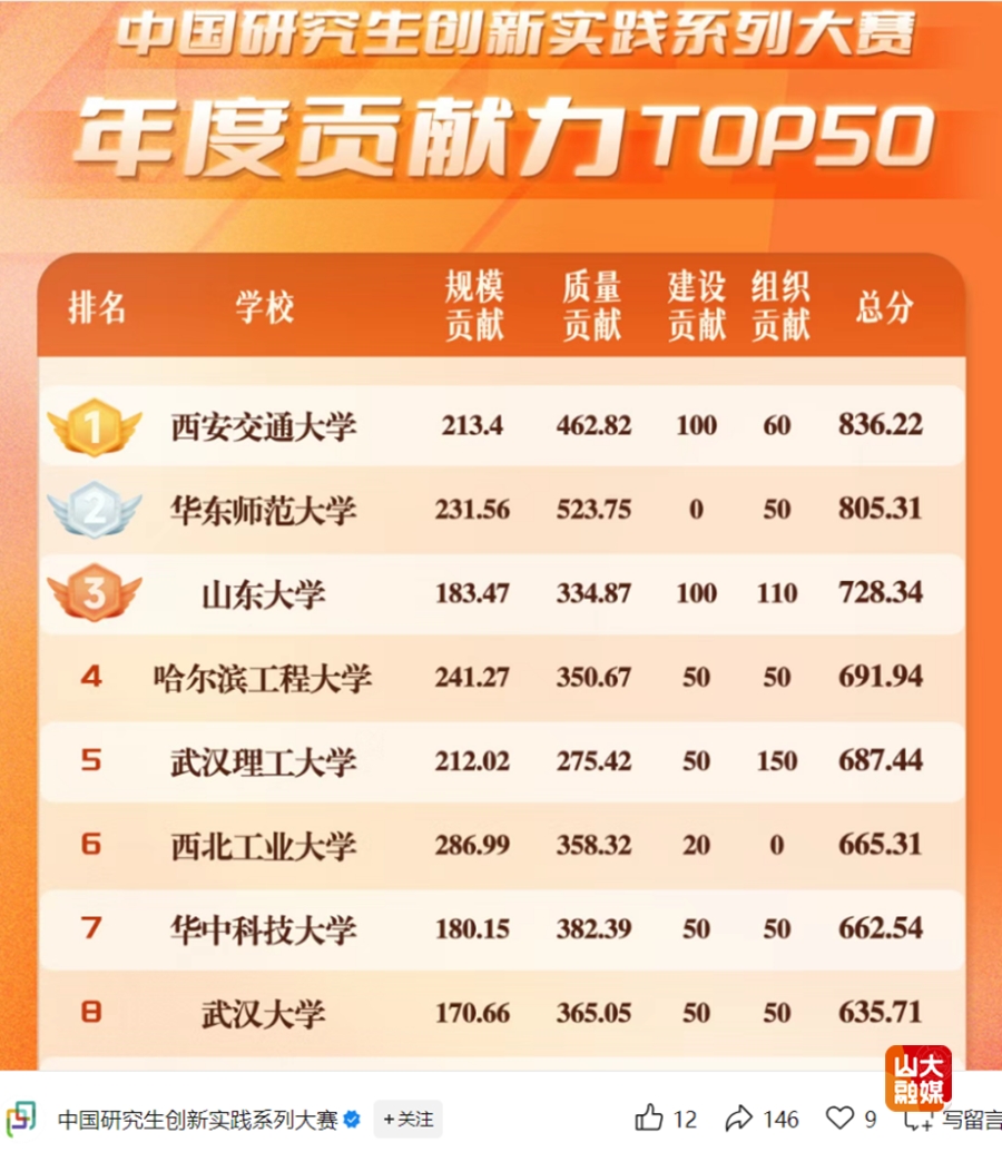 “中国研究生创新实践系列大赛”由教育部学位管理与研究生教育司指导,中国学位与研究生教育学会和中国科协青少年科技中心共同主办,是目前我国唯一被政府认可和指导的专门面向研究生群体的全国性赛事。2024年,山东大学在规模、质量、建设和组织贡献指标量化榜单中名列所有参赛高校前三甲,在“年度建设和组织力贡献”“年度人文社科和文化创新力贡献”榜单中双项夺魁,并实现了竞赛夺冠的历史性突破。