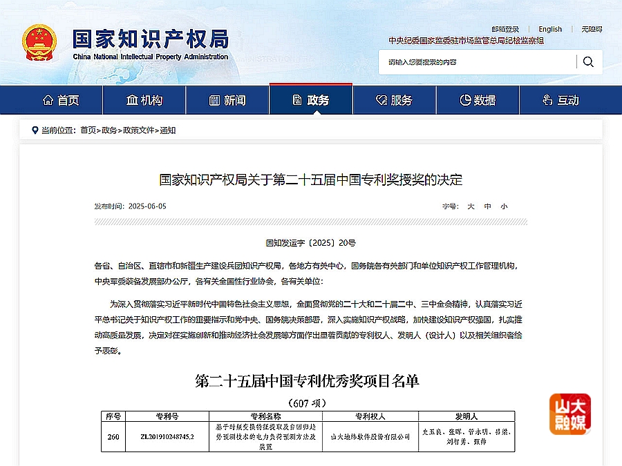 [本站讯]近日,国家知识产权局官网发布“关于第二十五届中国专利奖授奖的决定”,山大地纬公司授权发明专利“基于时频变换特征提取及自回归趋势预测技术的电力负荷预测方法及装置”荣获第二十五届中国专利优秀奖。
