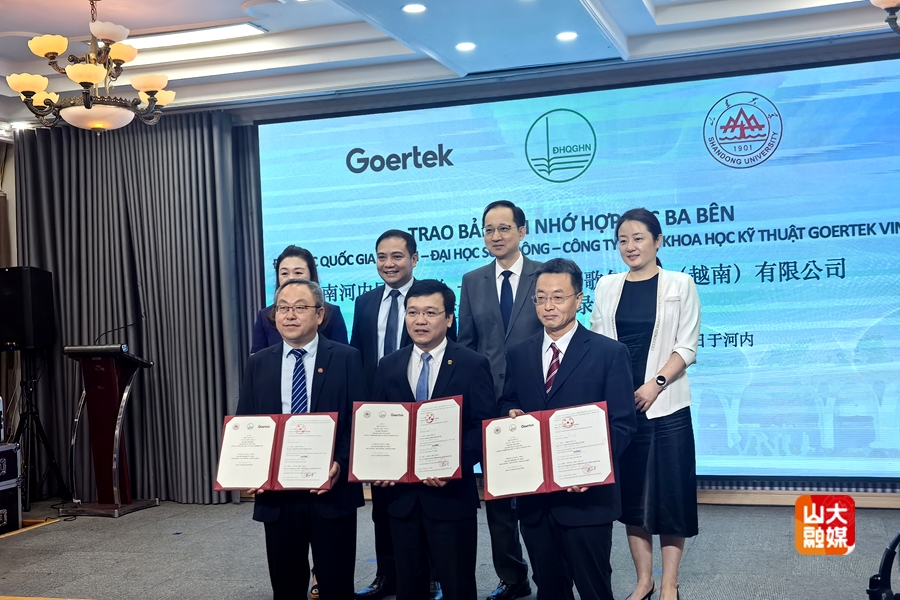 [本站讯]6月11日至13日,山东大学代表团应邀赴越南出席校企合作签约仪式,访问河内国家大学、河内中文学习测试中心等,参加“中国高等教育展”。在越期间,代表团拜访中国驻越南大使馆,访问歌尔科技(越南)总部,以高水平教育对外开放服务“一带一路”倡议。