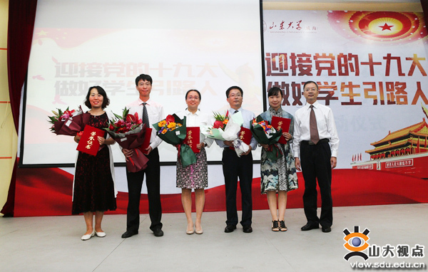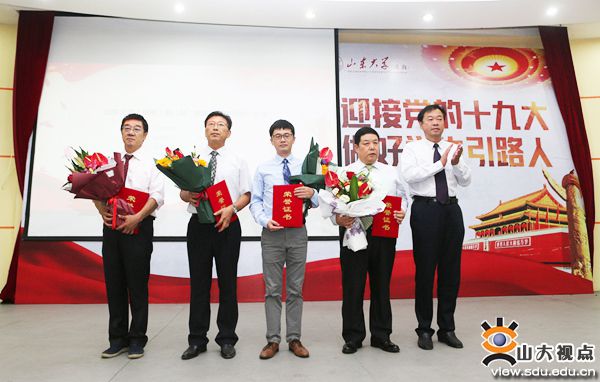尹作升为“第九届全国高校辅导员年度人物”荣誉称号获得者颁奖。会上,刘建亚宣读了《关于授予马秋丽等同志2017年“山东大学(威海)优秀教师”和“山东大学(威海)先进教育工作者”荣誉称号的决定》。山东大学(威海)副校长韩建新宣读了《关于表彰山东大学(威海)第八届“我最喜爱的导师”荣誉获得者的决定》。山东大学(威海)副校长刘海宣读了《关于表彰2016-2017学年“优秀本科生导师”的决定》。与会领导分别为受表彰教师代表颁发获奖证书。山东大学(威海)副校长陈冠军主持大会。