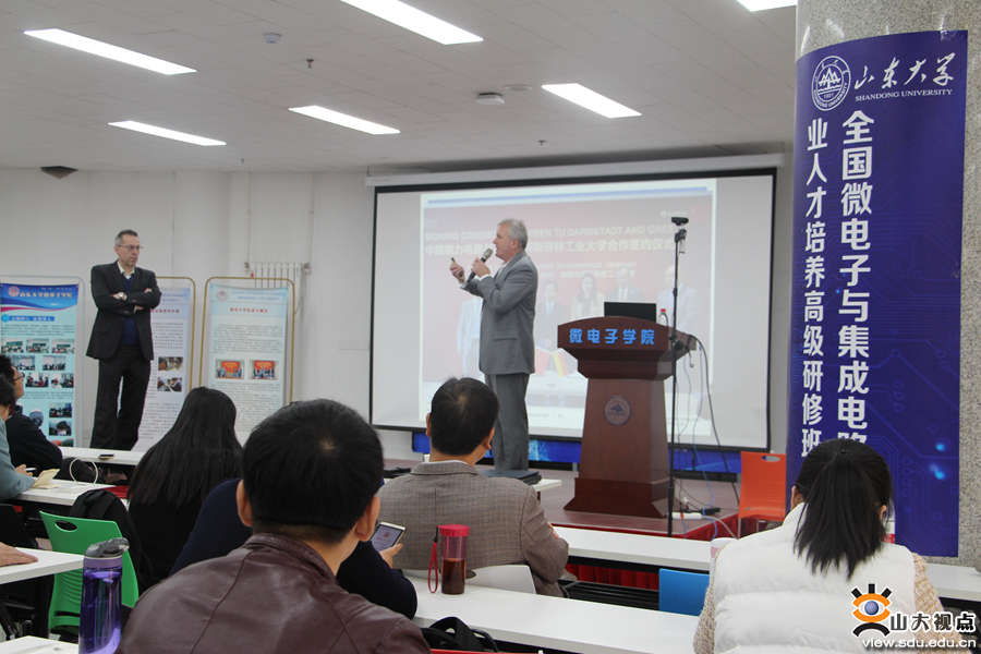 同时,为积极探讨推进校企联合集成电路设计和微电子人才培养新模式,与会代表还举办了集成电路专业和课程建设研讨会。中国政府“友谊奖”获得者、山东大学PETER POECHMUELLER教授,德国达姆施塔特工业大学Klaus Hoffmann教授,德国于利希研究中心研究员、山东大学兼职教授赵清太,新加坡南洋理工大学博士、河海大学曹元副教授,山东省物联网协会秘书长苏冠群高工,山东大学齐鲁青年学者、微电子学院特聘教授杨再兴,微电子学院副院长王永副教授,邢建平教授,山东大学青年教学能手、微电子学院徐辉进行了前沿讲座、理论和实验授课。来自高云半导体的葛庆国、朱宁太以及世界知名半导体企业UMC所属联暻半导体副董事长江新彪等10多名工程师进行了项目前沿应用设计实训授课、上机实验和工程设计经验分享。