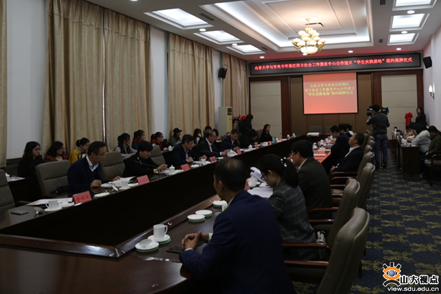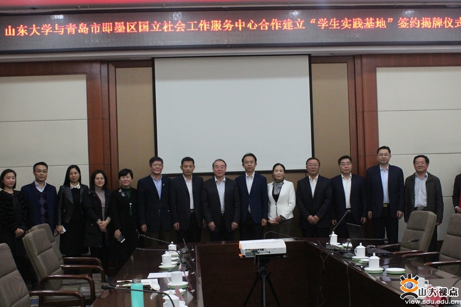 [本站讯]10月31日,山东大学与青岛市即墨区国立社会工作服务中心共建学生实践基地签约揭牌仪式举行。青岛市即墨区人民政府副区长宋宗军、青岛市即墨区总工会主席衣服坡、青岛市即墨区民政局局长宋修强,山东大学青岛校区党工委副书记郭邦礼、青岛校区学生工作部部长宋作标、哲学与社会发展学院党委书记郑倩等参加签约揭牌仪式。即墨区社会组织管理局局长兰爱萍主持仪式。