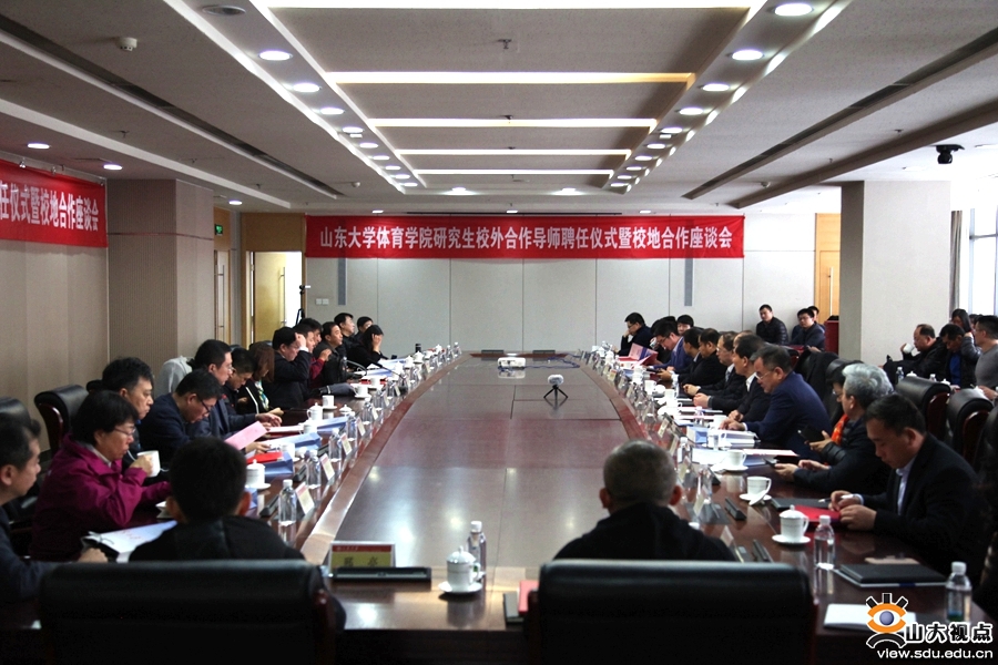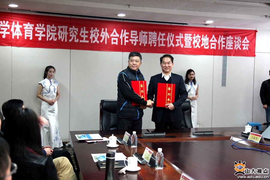 聘任仪式上,张永兵分别为李祥臣等26位研究生校外合作导师颁发了聘书,体育学院院长孙晋海与山东省武术院、山东省田径运动管理中心等11家单位签订了合作协议。山东省体育局各直属单位主任,山东体育产业知名企业董事长、经理人等山东省体育界政、产、学、研知名专家学者参加活动。