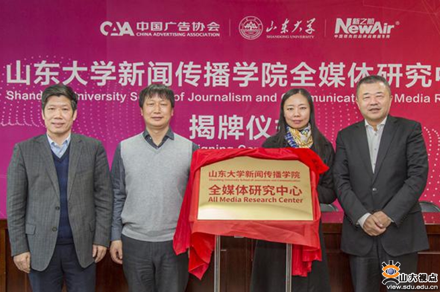 [本站讯]2018年12月26日,由中国广告协会、山东大学新闻传播学院、新之航传媒集团强强联合成立的大数据研发基地——山东大学新闻传播学院全媒体研究中心揭牌仪式在中心校区举行。中国广告协会副秘书长、《现代广告》杂志社社长赵华,新闻传播学院党委书记王德胜,新之航传媒集团董事长鞠航等相关负责人出席仪式并致辞。