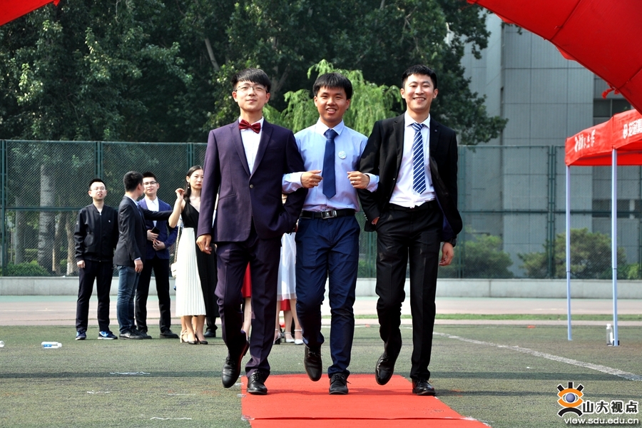 2019届毕业生在操场上依次走过红毯,在“管今朝芳华,理四载情长”的主题签名板留下自己的姓名,并合影留念。