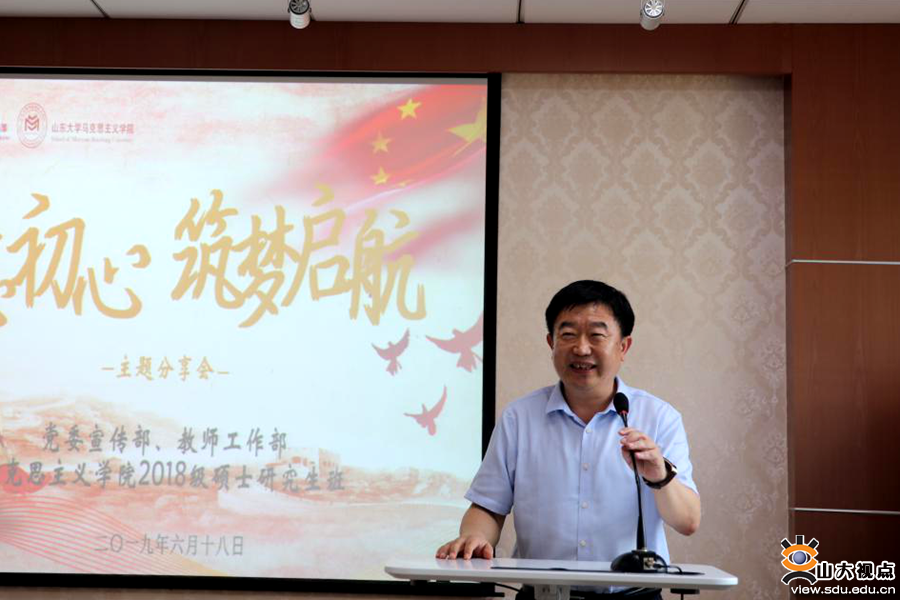 桑晓旻结合自身经历,分享了他对山东大学“初心”坚持的理解,高度赞扬了山大学子“朴实、老实、扎实”的学风和筑梦精神。同时,他对马院学生如何进一步“不忘初心、筑梦启航”提出了三点要求:一是要坚定对社会主义的理想信念,加强理论武装,将马学科的壮大与山东大学和祖国的发展融汇。二是要重视科研学习能力,提高自己的专业能力和综合素质,坚持高标准、严要求,以积极向上的精神风貌将服务山东与服务祖国结合。三是毕业生们要不忘“初心”,把山大的优良学风和传统传播到祖国的大江南北;在校生不仅要以优秀毕业生为榜样,还要勇于超越前人的成绩,不忘初心,积极进取,努力做到一代更比一代强。