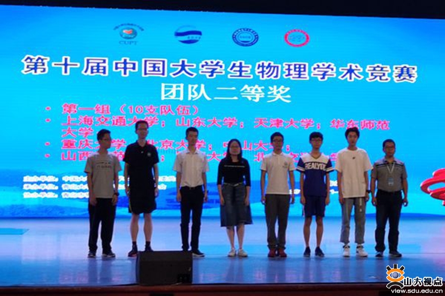 [本站讯]8月13日至14日,第十届中国大学生物理学术竞赛(China Undergraduate Physics Tournament,CUPT)在青岛大学举行。山东大学物理学院学生刘宇辰、何志宏、张奕晗、杜世泽、孙樵、潘立维、梁怀斐、孙政组成的代表队获得二等奖。