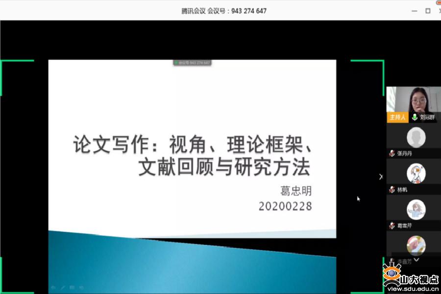 [本站讯]2月28日,哲社学院首期“线上开学季”讲座顺利举行,社会工作系葛忠明教授采用线上直播的方式作了题为“论文写作:视角、理论框架、文献回顾与研究方法”的讲座报告,社会保障专业刘冠群同学主持。200余名学生参加本次线上讲座。