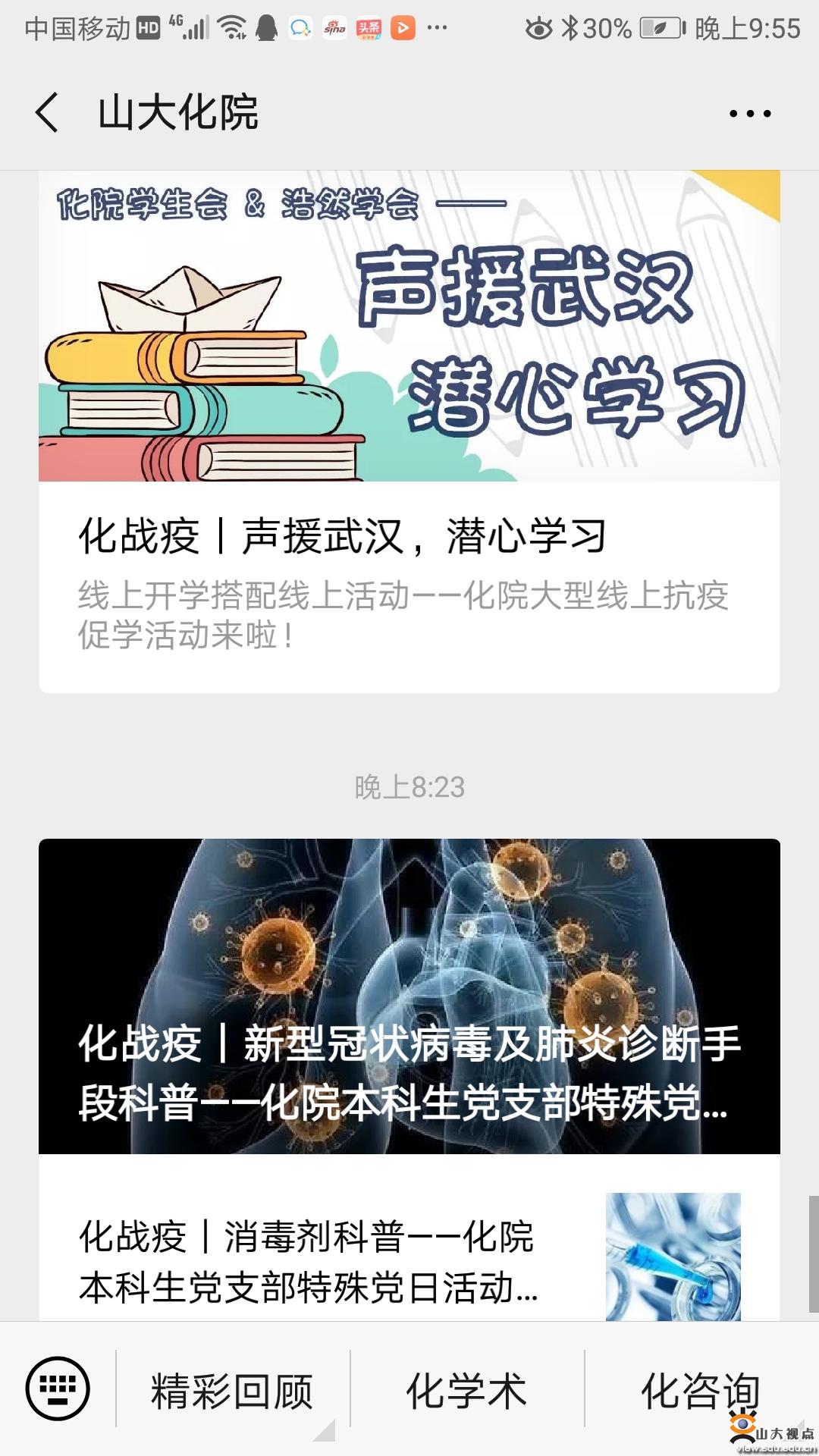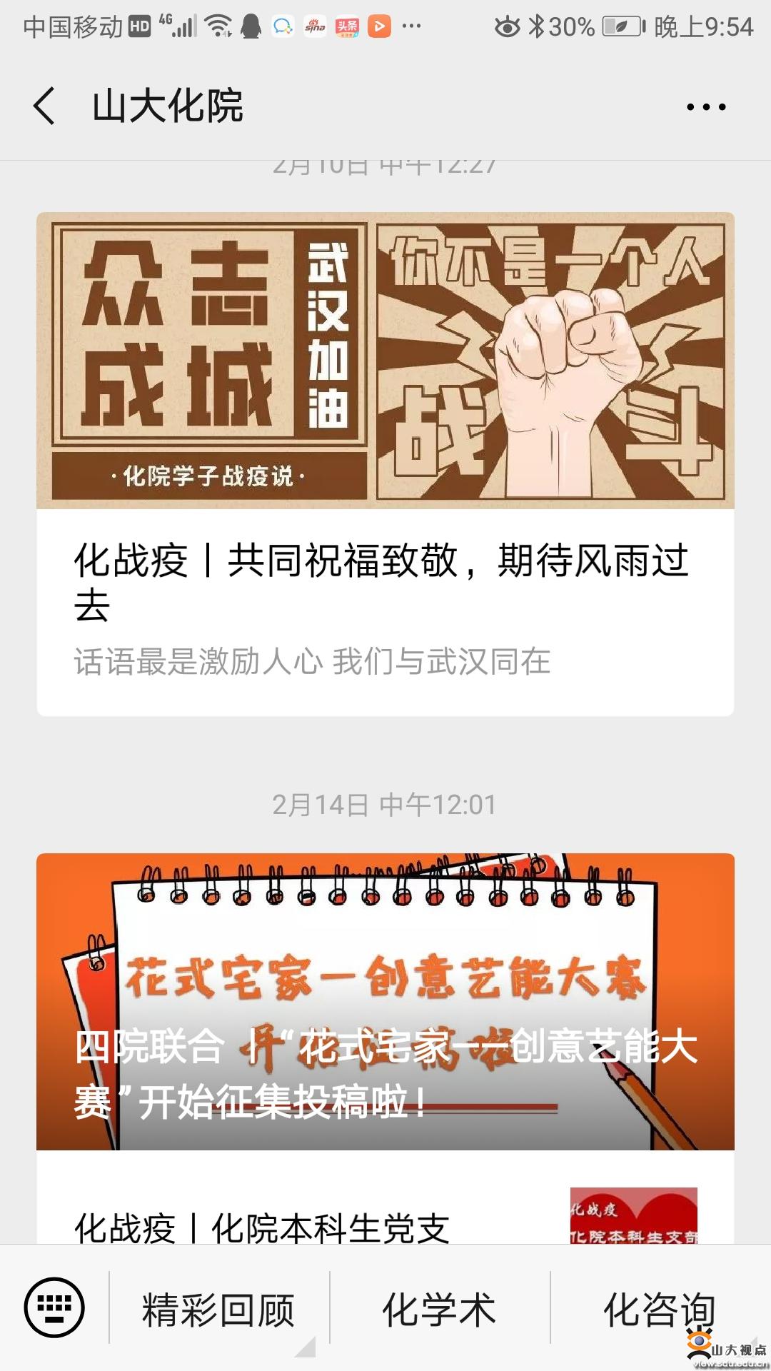 发挥优势,线上活动声援武汉。化院本科生党支部开展了三期特别党日活动,其中一期为“声援武汉,共抗疫情”,党员与入党积极分子将自己对武汉抗疫一线白衣天使们的敬意化作一首首发自肺腑的小诗,一段段深情的语音,汇集起对一线工作者和武汉人民的关心与祝福,目前正联系渠道准备发往武汉前线;另外两期内容是发挥专业优势,开展病毒、荧光检测、消毒剂等相关知识的科普宣传,带领大家了解新冠病毒的特点及肺炎诊断手段。学生会收集了全院各班各省份同学想对武汉抗疫一线工作人员说的话,通过微信公众号,传递着化院学子对武汉抗疫的必胜决心和对一线战士深深的敬意与关切。浩然学会社团与化院学生会联合举办的“声援武汉,潜心学习”线上抗疫促学活动开辟了为武汉加油的新方式,将收集的视频与音频通过学校发送到武汉抗疫一线,送去化院学子的关心与敬意。