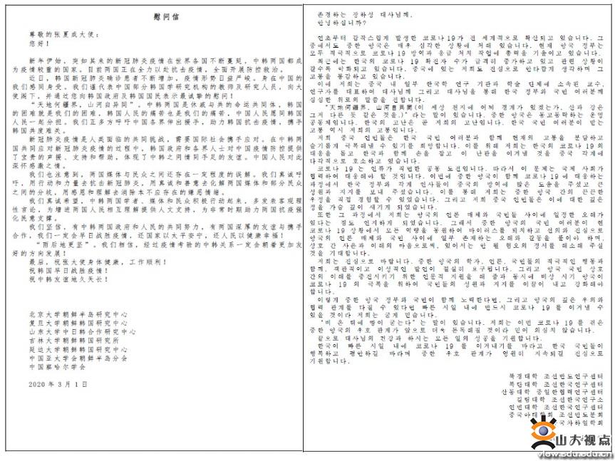 [本站讯]3月1日,针对当前韩国日益严峻的新冠肺炎疫情形势,山东大学中日韩合作研究中心联合北京大学、复旦大学、吉林大学等高校的韩国学研究机构向韩国驻华大使馆发去慰问函,向韩国政府及韩国国民表示同情与慰问。