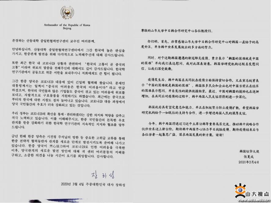 3月4日,韩国驻华大使张夏成向山东大学中日韩合作研究中心回信,感谢对韩国的高度关注,以及为韩中关系发展作出的多方面努力。回信表示,在共同应对疫情的过程中,韩中两国人民友谊将得到进一步深化,期待韩中两国齐心协力早日战胜疫情,同时希望韩国学研究机构给予一如既往的支持与合作,期待疫情结束后与各位学者一起集思广益、谋求两国发展的新方案。
