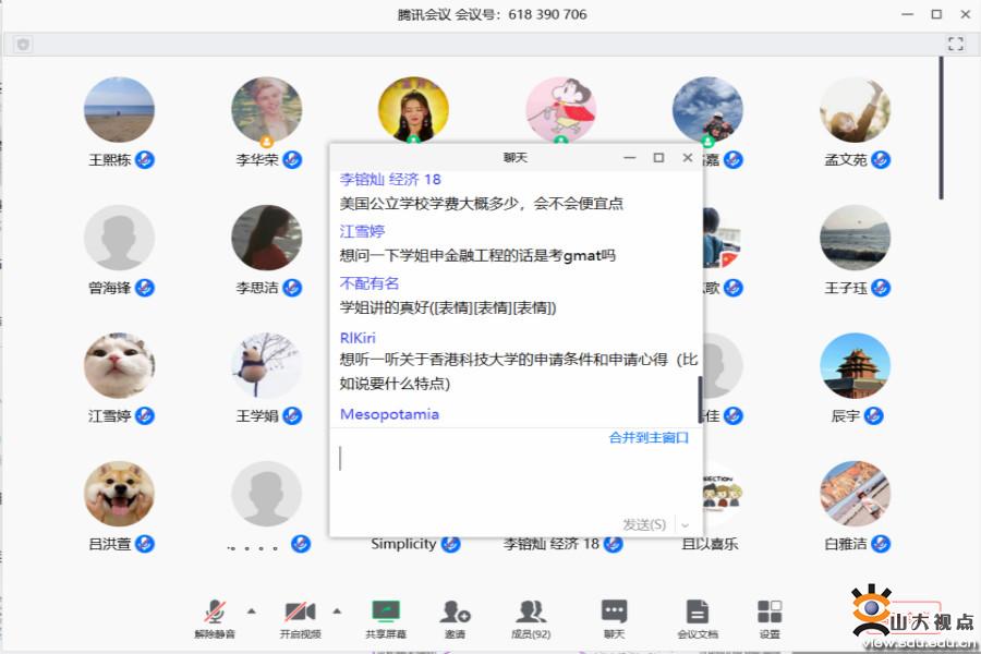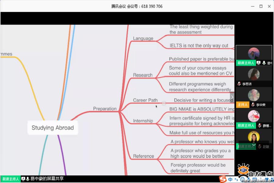 [本站讯]3月22日晚,山大在鄂学生第二临时团支部与经济学院学生会联合主办的“战疫有我,共同成长”分享会暨青春线上团课第二期在腾讯会议举行。本期分享会主题为“我的留学申请之路”,会议邀请到了在2019 FAll申请季中获得多所世界名校录取通知的四位2016级经济学院学生——葛中豪、薛博文、赵璇、汪路嘉,在疫情期间为同学们的留学规划之路解疑答惑。