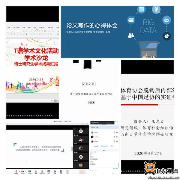 周庆华就疫情期间如何合理利用时间做学术,为研究生会和同学们提出建议:同学们应主动积极参与各种学术报告,珍惜每次学术交流的机会;讲座的成功开展,需要研究生会从主题设计、主持、流程安排等下功夫,把T语系列学术文化活动打造成体育学院的品牌文化。王先亮对三位博士研究生在论文撰写上的心得、经验给予肯定,认为通过他们的分享使其他同学在学术科研学习上受益颇多,并对他们所取得的学术成果表示祝贺。崔莉莉表示,学术沙龙活动是一个供同学们交流学习的平台,希望大家能够积极参与,研究生教育管理办公室将为同学们做好后勤服务。动员同学们积极参与学院读书打卡活动,养成良好的生活和学习习惯,为开学做好准备。