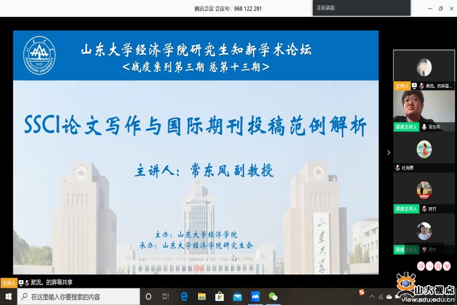 [本站讯]3月27日下午,经济学院第十三期研究生知新学术论坛(战疫系列第三期)以线上会议形式举行。经济学院金融系主任常东风为学院师生带来了题为“SSCI论文写作与国际期刊投稿范例解析”的报告。论坛由副院长石绍宾主持。