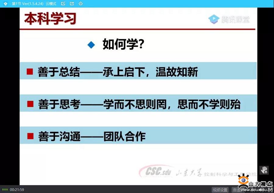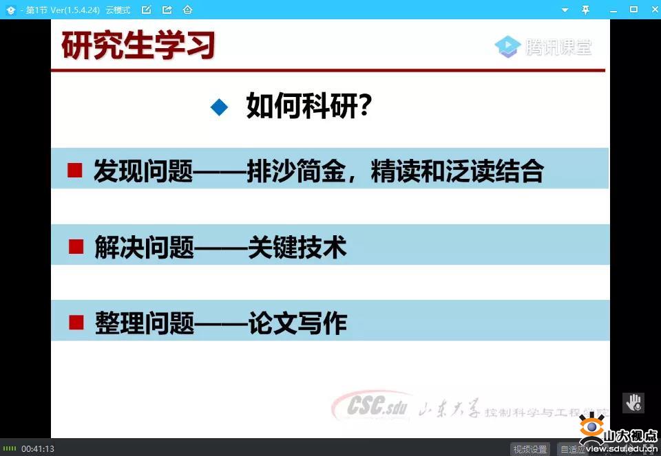 [本站讯]为深入贯彻落实学校疫情防控与2020春季学期工作会议精神,促进学生学业健康发展,3月27日,山东大学控制科学与工程学院团委组织开展的“名师助我成长系列之春笋讲堂”第六期在腾讯课堂上开讲。本期主讲人是山东大学特聘教授、博士生导师、2019年度国家自然科学基金优秀青年科学基金获得者、国家优秀青年科学基金人才徐娟娟教授。本次讲座吸引了300多名学生前来观看。控制学院有关负责人、院团委相关人员、学院有关辅导员参加活动。