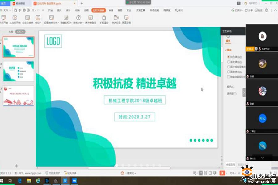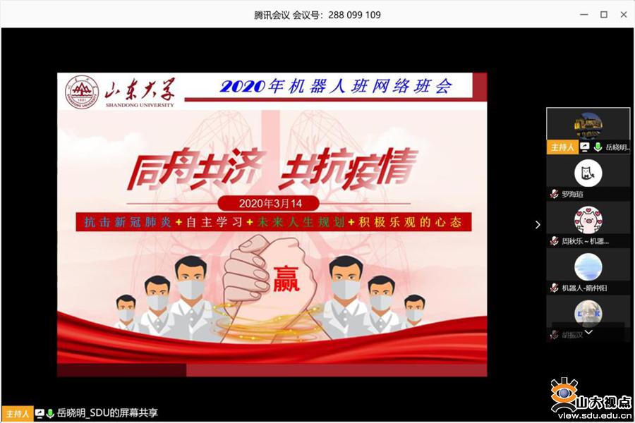 2017级“云”班会以学生的未来规划及发展为重点。国际班以“你我同行 不负韶华”为主题,班主任国凯为同学们分析今年的就业形势以及目前机械行业的就业前景。机电班班主任李淑颖对班委们接下来的班级工作进行了指导,并通过分析2016级的考研、就业情况,督促同学们充分利用时间,做好保研、考研或者就业方面的准备。机器人班班主任岳晓明、机设班班主任高玉飞、车辆班班主任朱向前向同学们讲述了我国近年来综合国力显著提升的突出成绩,并分析解读了机械制造业的广泛前景,帮助同学们分析当前环境下就业与读研的发展形势。过控班班主任刘竞婷、产设班班主任范志君鼓励同学们为自身学习生活做出合理规划,将学业课程与实习工作分清主次、合理搭配。卓越班班主任王继来、工业工程班班主任王黎明提醒同学们要保质保量完成学习任务,继续保持学习热情、创新精神和卓越品质,身体力行传承和弘扬山大精神,为本科最后阶段的冲刺做好一切准备。