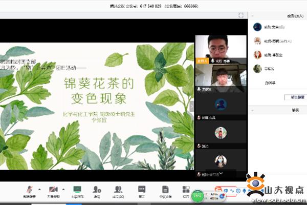 本次主题团日活动号召同学们结合专业知识和生活中的点滴,在日常生活中发现科学现象或利用所学知识解决生活中的小问题,展示生活中的物理和化学。活动分两大部分共计六个环节展开。活动伊始,支部同学们逐一进行了自我介绍,分享了个人所学专业及居家生活学习情况。活动第二个环节,化学院2019级硕士研究生王创进行了抗击疫情志愿服务经历的交流分享,讲述了自己在担任黄冈市社区基层抗疫志愿者期间的经历,号召更多同学尽己所能为家乡抗击疫情贡献力量。随后,物理学院2016级本科生黄名山分享了近几个月在抗击疫情、居家学习中的体会和感悟,提到自己在抗击疫情期间深刻感受到了党和国家集中力量办大事的显著优势,特别为山大的白衣天使们自豪,也期待2020的春天能够跟大家相聚济南、相聚中心。