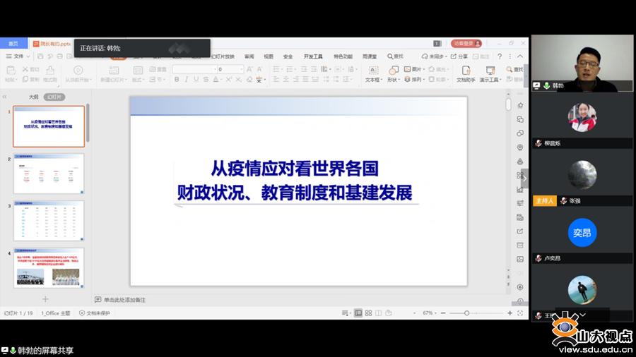 本次讲座的主题是“从疫情应对看世界各国财政状况、教育制度和基建发展”。韩勃希望同学们密切关注此次疫情,辨别新闻真伪,从现象看本质,对本次疫情提出自己的判断和理解。他介绍了世界各国应对疫情所采取的措施,并分析了疫情反映出的各种问题,表示我国在财政、教育、基建方面都存在优势。教育制度方面,韩勃向同学们介绍了土建学院“产学研赛”特色创新培养模式的优势,即以大平台、大人才、大项目、大成果为支撑,从国家重点工程中凝练科学问题,融合于学生知识、创新意识和综合素质培养中。这种教育模式有利于同学们开拓视野,将知识与实际应用相结合,从而更好地理解书本知识并运用于工程实践。此外,韩勃希望同学们能够多和老师交流,接触科研项目,参加学科竞赛。他鼓励大家拓展国际化视野,多多了解国外科研方向,同时介绍了学院国际化培养特色,通过双学位项目、国际学分计划、海外师资暑期学校等提高学生国际化能力。