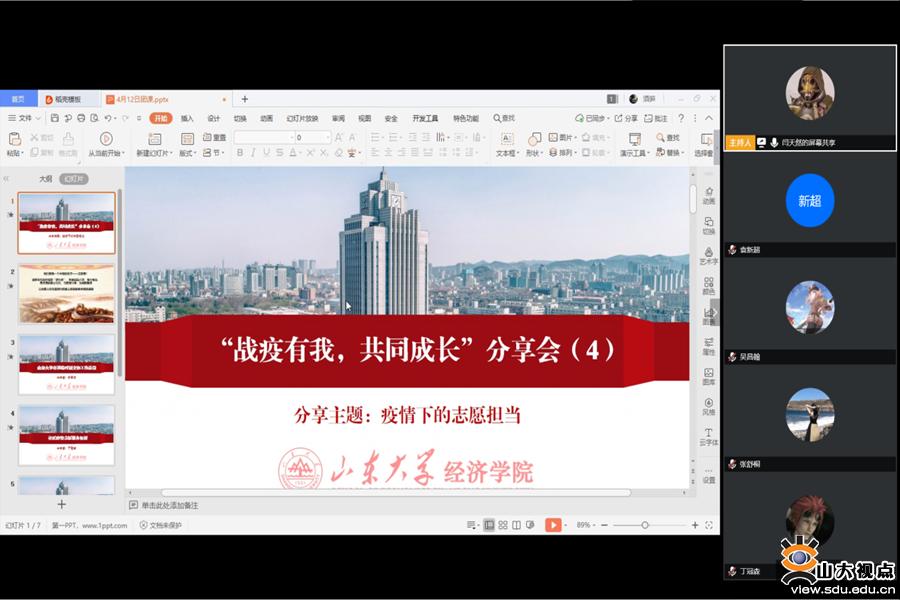 [本站讯]4月12日晚,经济学院学生组织与在鄂学生第二临时团支部在线联合举办“战疫有我,共同成长”第四期分享会,会议邀请了丁冠森、李东林、郑芷蓉、李思洁四位在疫情期间积极投身于志愿活动的经院学子,分享他们的心得体会。学院团委书记暨山大在鄂学生第二临时团支部指导员王永军参加线上分享会。