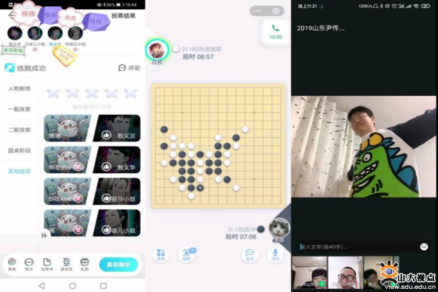 云上互动多样,学习交流共举。部分学生宿舍通过网络平台开展了丰富多样的剧本推理、棋盘竞技、你比我猜等线上趣味活动,同时进一步沟通交流了居家的专业学习问题,在轻松活泼的氛围下,形成了互帮互助、共同进步的良好氛围。222宿舍进行的“剧本杀”“谁是卧底”等活动让同学们在网络互动中增进了友谊、切身感受到了来自宿舍的温暖和快乐。1604宿舍在“云见面”中相约了第一届充满欢声笑语的宿舍线上五子棋大赛。1611宿舍通过视频充分交流了最近的读书心得,大家普遍认为“读历史书不是做数学题,读书时会有多种理解,通过交流才能共同进步。”129宿舍通过“云见面”启动了线上互助小组,同学们相约一起学习并互相监督,度过一个充实而有意义的学期。